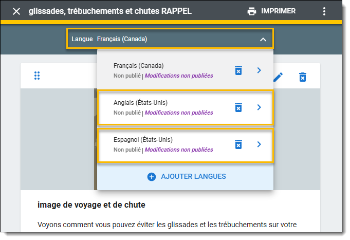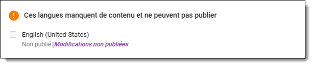 - Si le contenu que vous venez d'ajouter n'est pas disponible dans d'autres langues, vous ne pourrez pas publier ce cours.