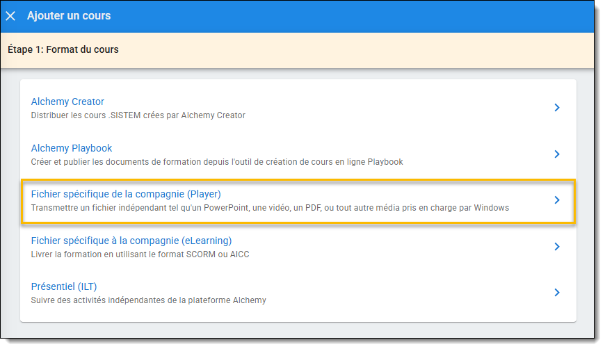 - Dans le menu du format du cours, sélectionnez le Fichier spécifique de la compagnie (Player)