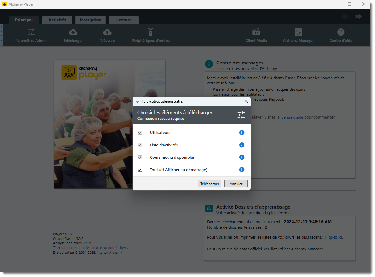 - Lancez Player, Sélectionnez Télécharger à l'ouverture de la fenêtre contextuelle des paramètres administratifs pour vous assurer que tout le contenu disponible est mis à jour.
