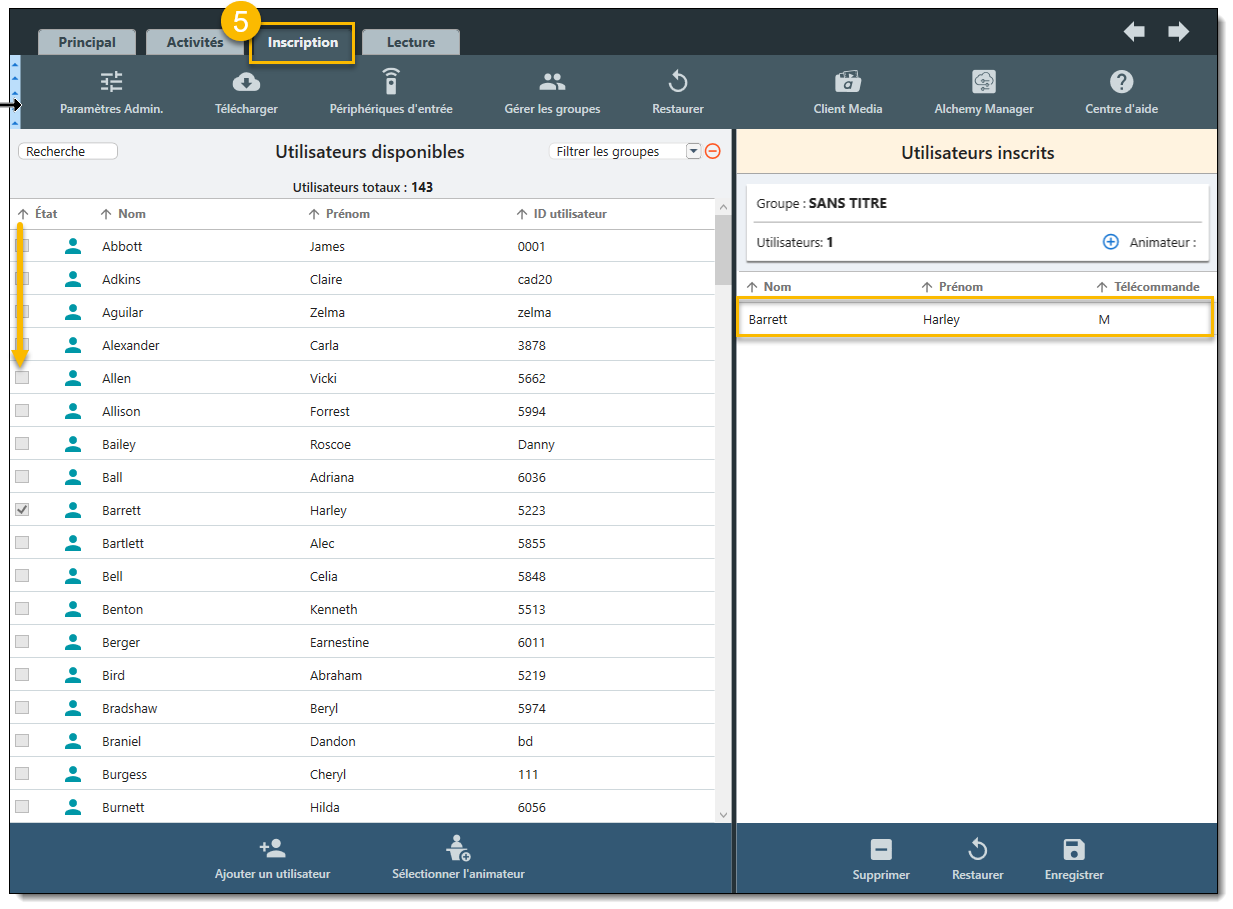 - Naviguez vers l'onglet Inscription et inscrivez les utilisateurs au cours en sélectionnant le nom des utilisateurs à ajouter au volet Utilisateurs inscrits sur la droite