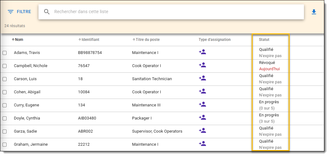 Dans l'onglet Affectations, la colonne Statut indique la progression de l'utilisateur ou le nombre de jours restants avant que la qualification professionnelle ne doive être renouvelée.