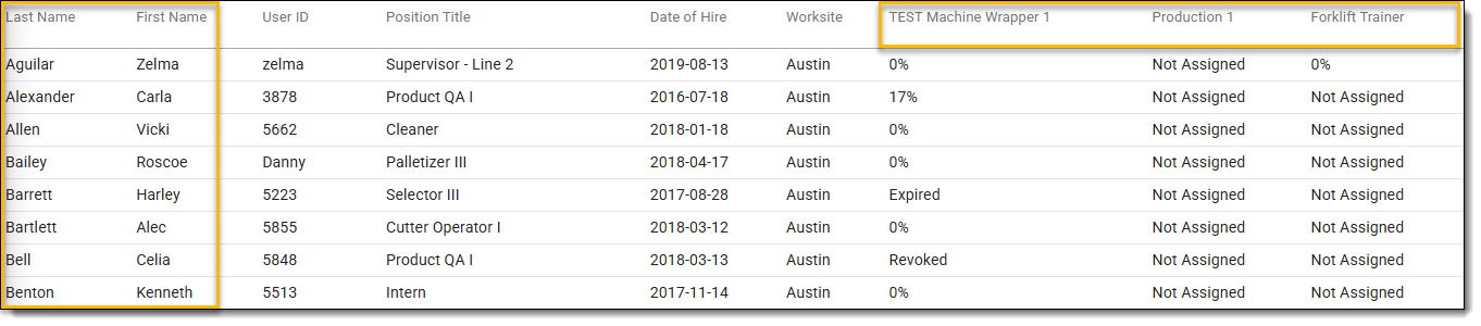 La matrice des compétences d'exportation montre toutes les compétences professionnelles attribuées sur le chantier, ainsi que chaque employé affecté à une compétence professionnelle. La matrice indique la progression des qualifications professionnelles pour les individus. Il est également possible d'afficher la matrice de qualification du rapport intelligent, qui est personnalisable. Pour plus d'informations sur la personnalisation des filtres et des colonnes dans Smart Report, voir Utilisation de SMART Reports.