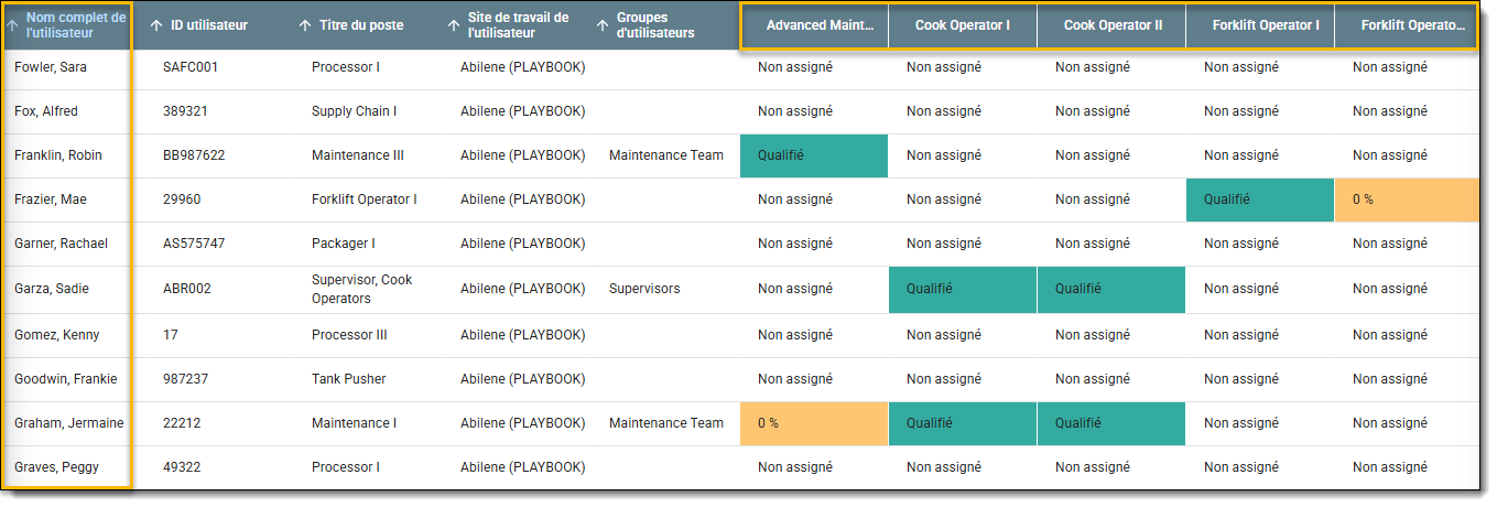 - Les noms des compétences professionnelles sont affichés dans les colonnes.
