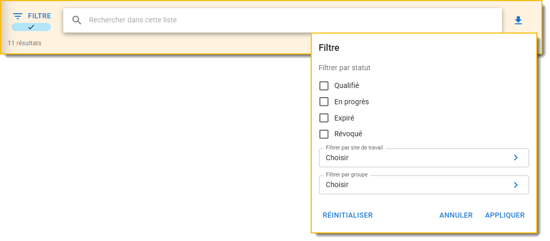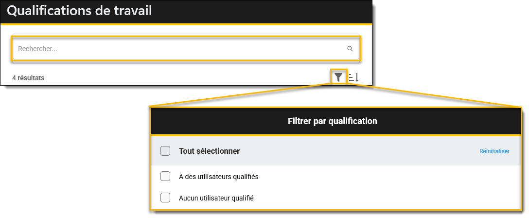 Dans le menu Qualifications, utilisez la barre de recherche pour rechercher des qualifications. Utilisez l'icône Filtre pour rechercher les qualifications qui ont des utilisateurs qualifiés et celles qui n'ont pas d'utilisateurs qualifiés.
