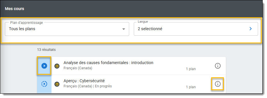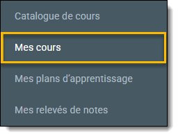Remarque: les cours listés dans Mes Cours font partie d'un Plan d'apprentissage qui vous a été assigné par un superviseur. Certains cours qui vous ont été assignés dans le Plan d'apprentissage peuvent ne pas être disponibles dans eLearning et ne s'afficheront pas dans cet onglet.
