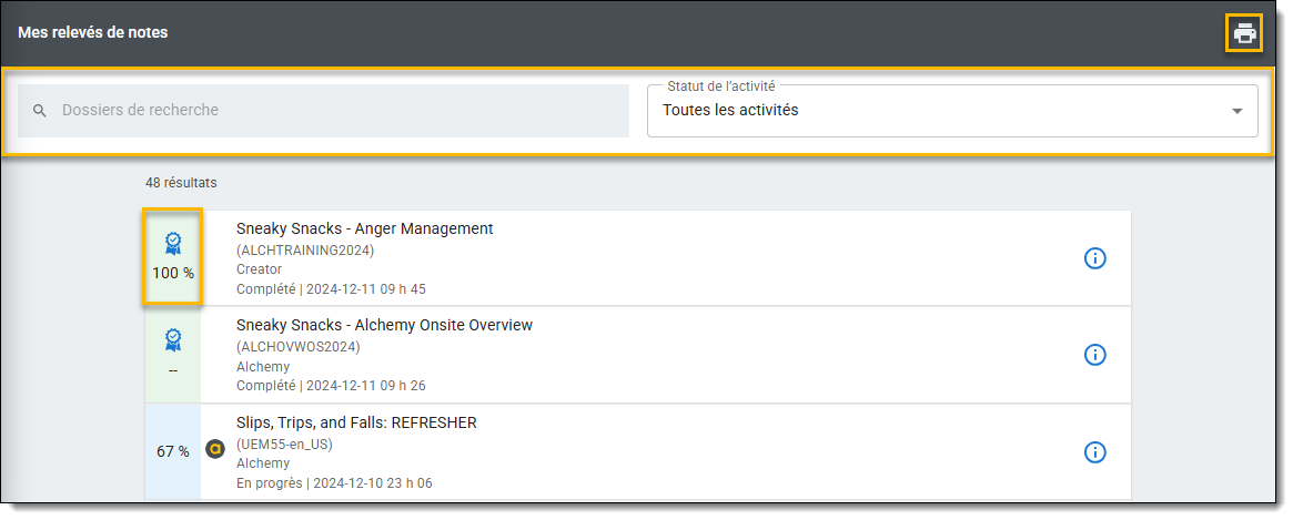 - Pour les cours terminés avec succès, il peut y avoir un certificat disponible pour impression.