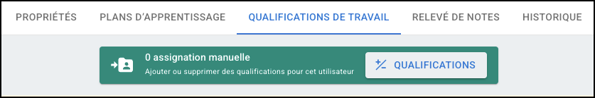 Dans l’onglet Qualifications de poste, vous pouvez gérer les qualifications attribuées à l’utilisateur que vous consultez. Attribuez manuellement des qualifications de poste à l’aide de l’icône +/- Qualifications