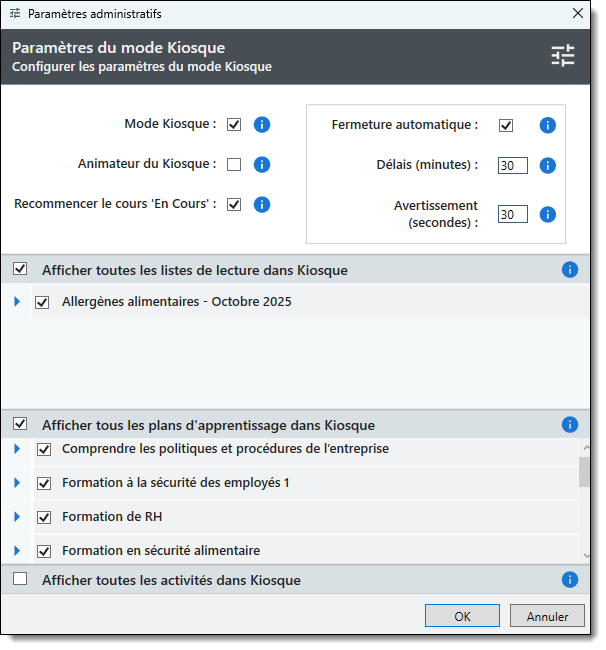 Afficher toutes les activités dans le kiosque: Sélectionnez cette option pour que toutes les activités de formation (cours, examens, évaluations) soient disponibles en mode kiosque.