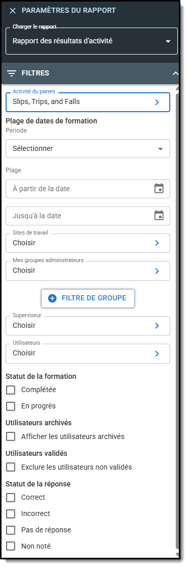 Le rapport sur les résultats des activités affiche les questions de test, les réponses et les résultats des différentes activités des employés, avec la possibilité de cliquer pour voir les détails de chaque enregistrement. Cet article vous guide à travers les différentes options de filtre et de colonne disponibles dans ce rapport. Pour obtenir des instructions sur la navigation dans les rapports SMART, voir Utilisation des rapports intelligents.