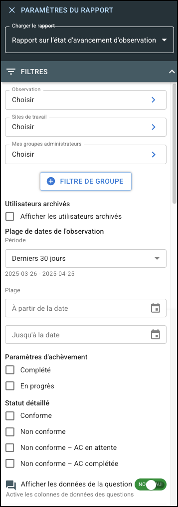 Le rapport sur le statut des observations affiche les observations soumises et leur statut. Cet article vous guide à travers les différentes options de filtre et de colonne disponibles dans ce rapport. Pour obtenir des instructions sur la navigation dans les rapports SMART, voir Utilisation des rapports intelligents.