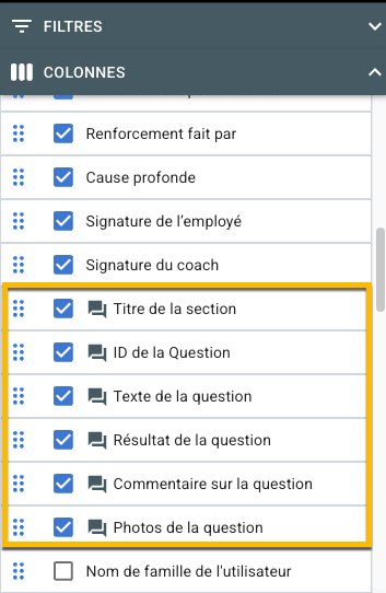 Colonnes disponibles via la bascule Afficher les données de la question