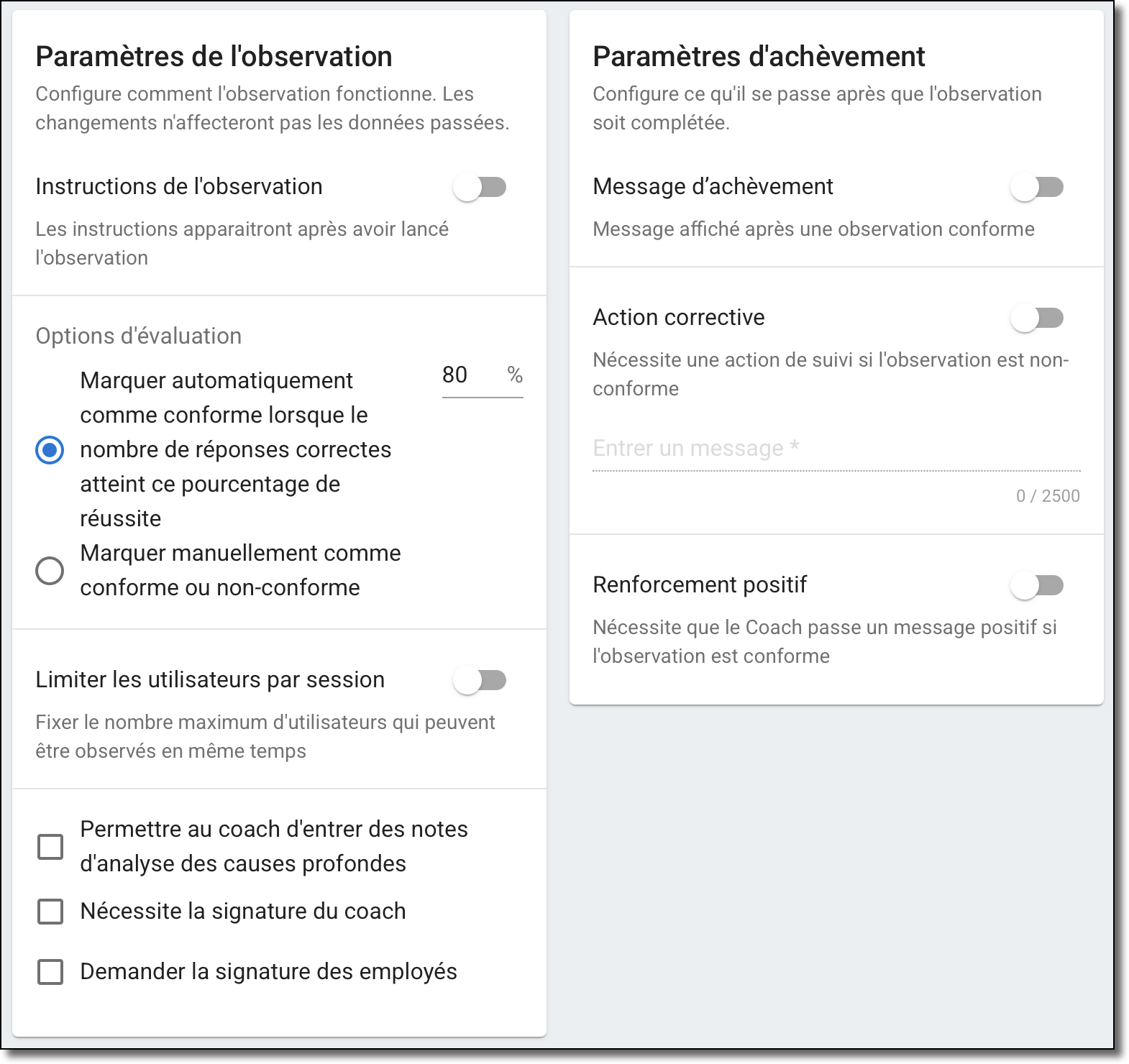 - Sélectionnez Noter automatiquement pour que l'observation soit automatiquement notée conforme ou non en fonction du pourcentage de réussite.