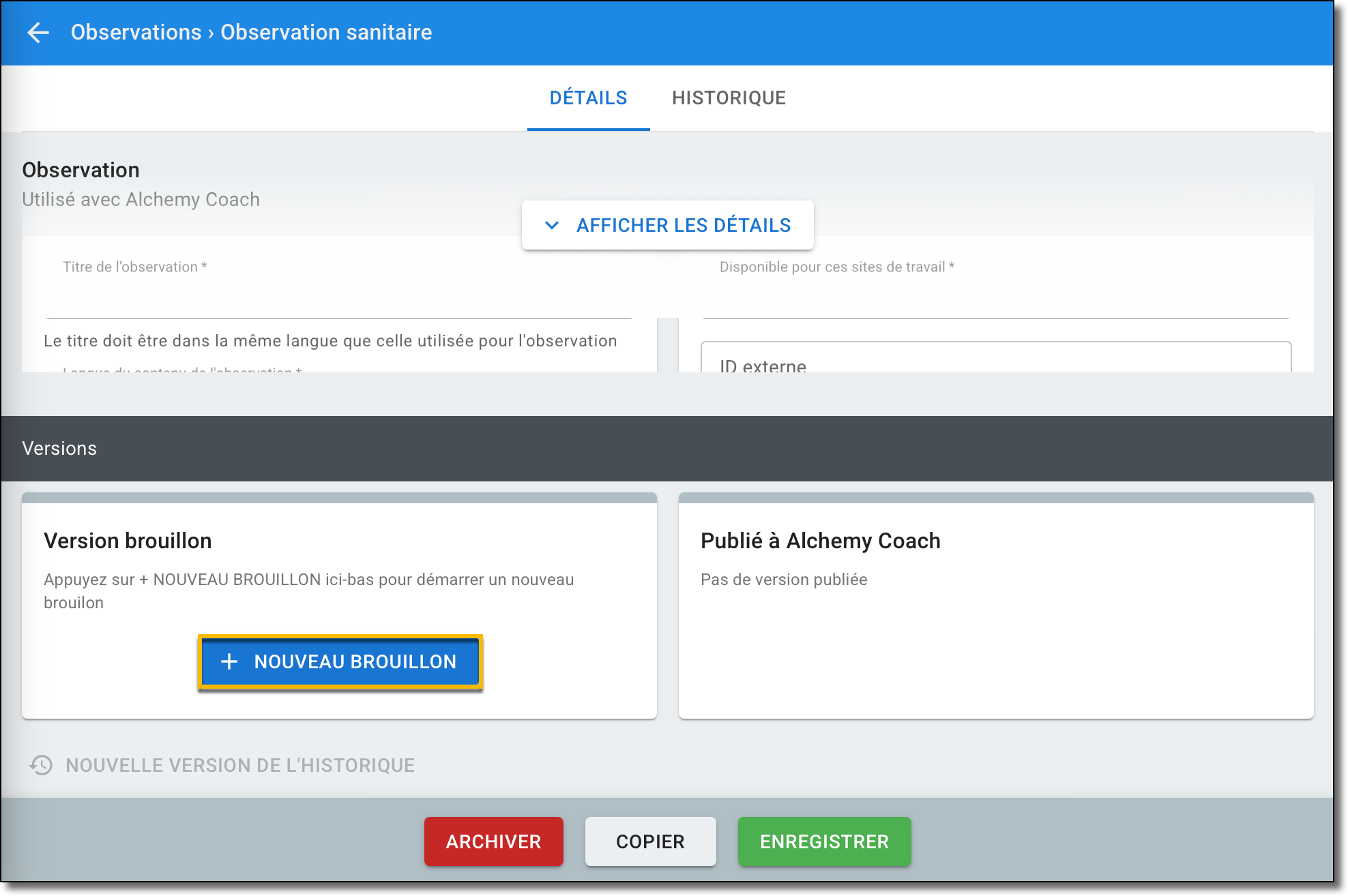 - Sélectionnez Nouveau brouillon pour commencer une ébauche de l'observation.