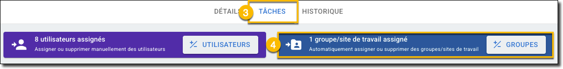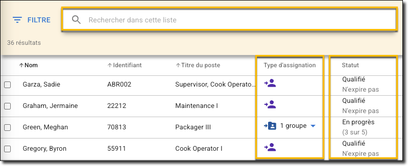 - Voir le type d'affectation des utilisateurs (affectation manuelle ou par l'intermédiaire d'un groupe).