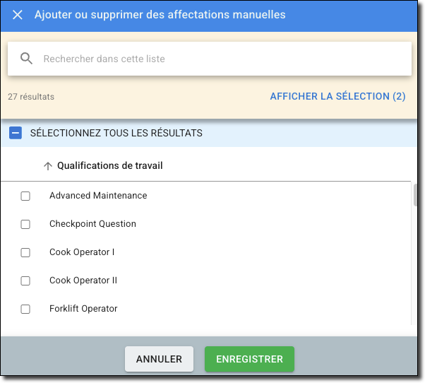 - Sélectionnez une ou plusieurs qualifications professionnelles, puis cliquez sur Enregistrer.