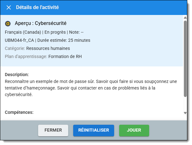 - Cliquez sur RÉINITIALISER pour réinitialiser un cours en cours. Cela supprimera toute progression et votre relevé de notes.