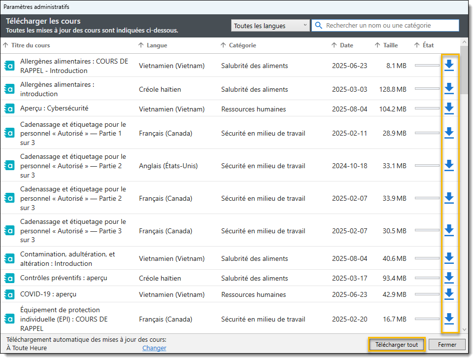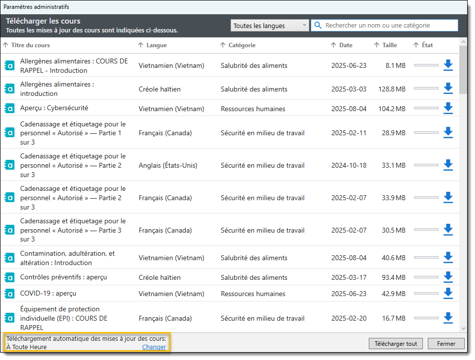 La fonctionnalité de téléchargement automatique des cours met à jour les cours précédemment téléchargés dans Player. Les supports de cours énumérés dans la fenêtre «Télécharger les cours» demeurent les plus récents. Pour accéder à cette fonctionnalité, contactez votre gestionnaire de compte.
