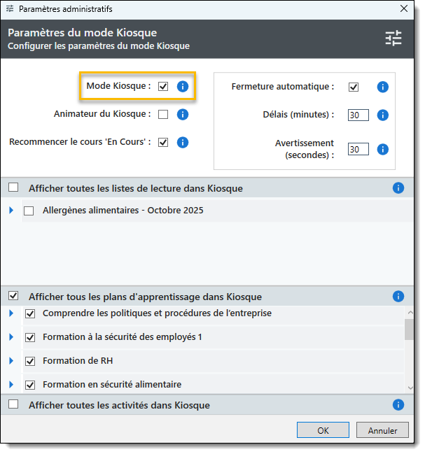 Afficher toutes les activités dans le kiosque: Sélectionnez cette option pour que toutes les activités de formation (cours, examens, évaluations) soient disponibles en mode kiosque.