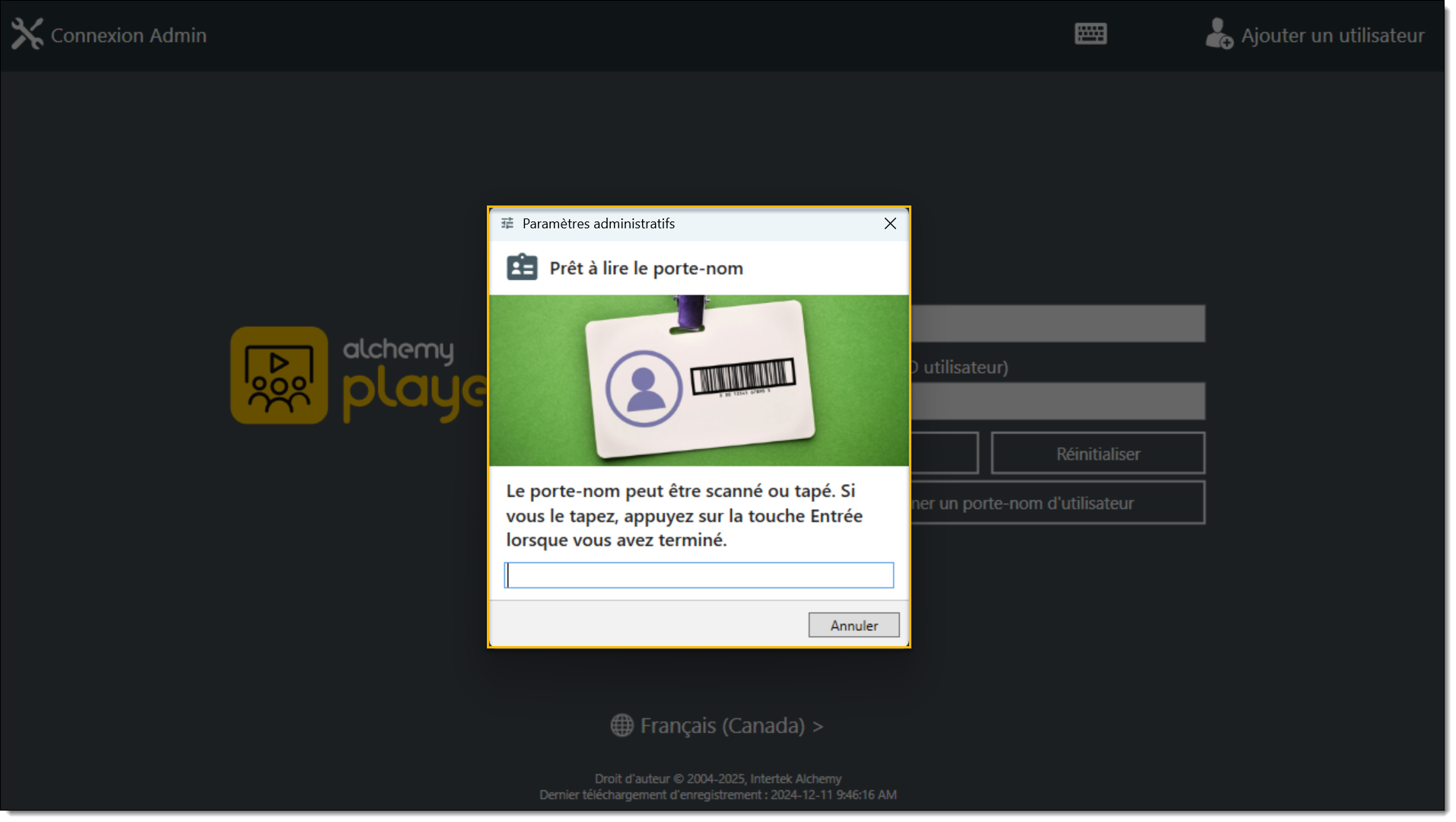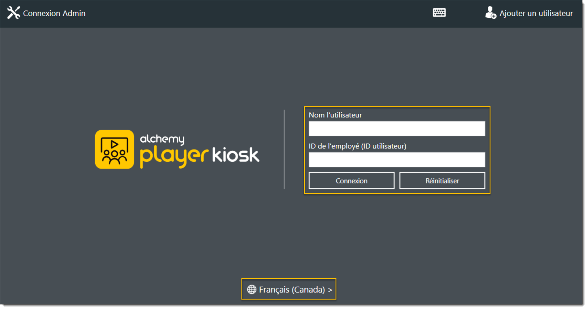 Une fois le mode kiosque activé, l'utilisateur doit s'identifier à l'aide d'un clavier ou d'un lecteur de badges (s'il est installé).