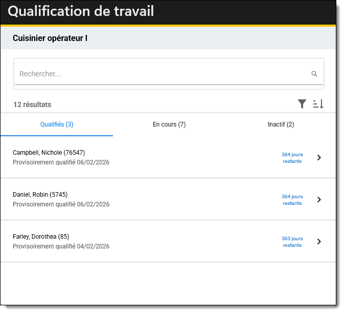 - Onglet En cours: affiche les utilisateurs qui n'ont pas encore terminé leur qualification professionnelle.