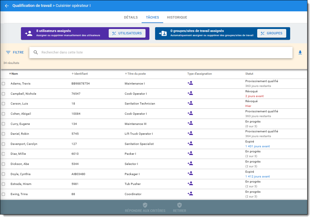 - Onglet Inactif: affiche les utilisateurs qui ont été révoqués ou dont les qualifications professionnelles ont expiré. Si la qualification professionnelle d'un utilisateur a expiré, il peut encore la renouveler et redevenir qualifié.
