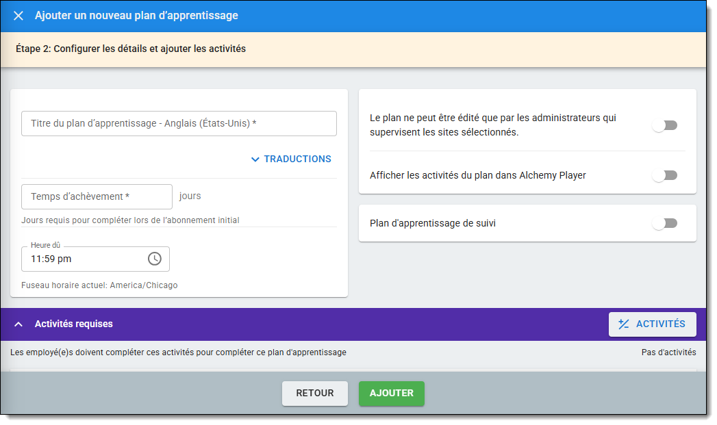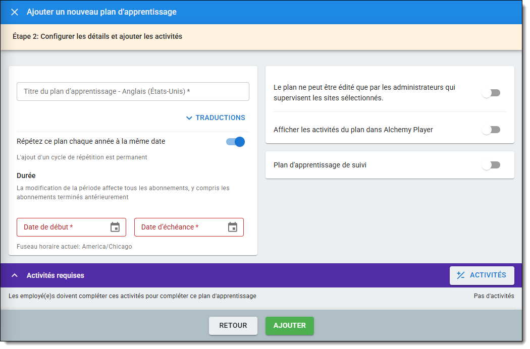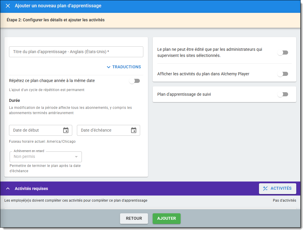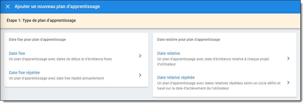 Il s'agit d'un Plan d'apprentissage dont les dates de début et de fin sont fixes, avec la possibilité d'ajouter une fenêtre d'achèvement tardif. Il s'agit du type de Plan d'apprentissage le plus souple à créer et à modifier. Si vous êtes novice en matière de Plan d'apprentissage, c'est le meilleur type de Plan d'apprentissage pour commencer. Pour en savoir plus, consultez l'article Fixed Date Learning Plans.