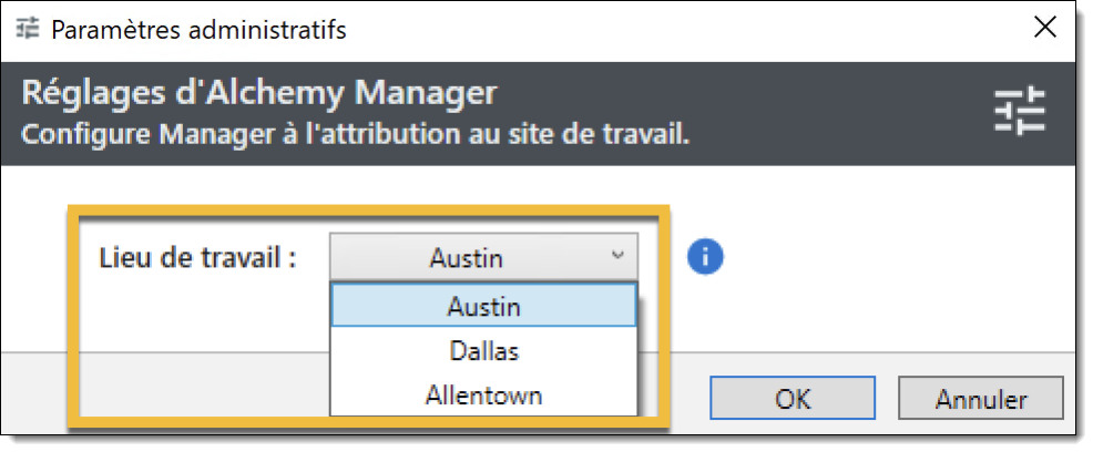 - Si vous ne voyez qu'un seul lieu de travail, contactez l'administrateur de votre site pour configurer votre Player d'Alchemy pour d'autres lieux de travail.