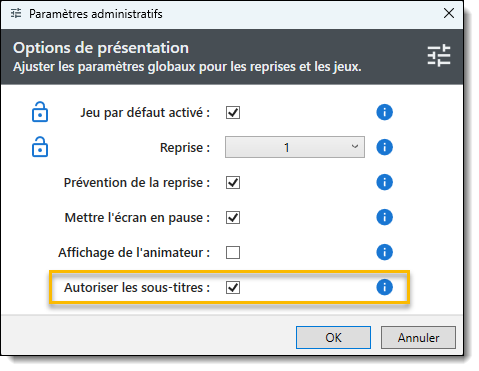 - Affiche le texte du sous-titrage correspondant à la langue sélectionnée pour le cours