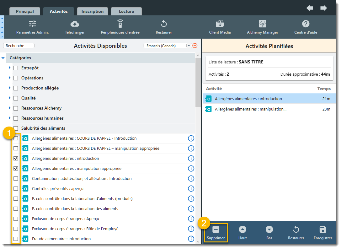- Pour ajouter des activités individuelles, cochez la case à droite de l'activité