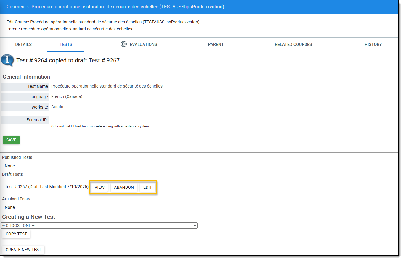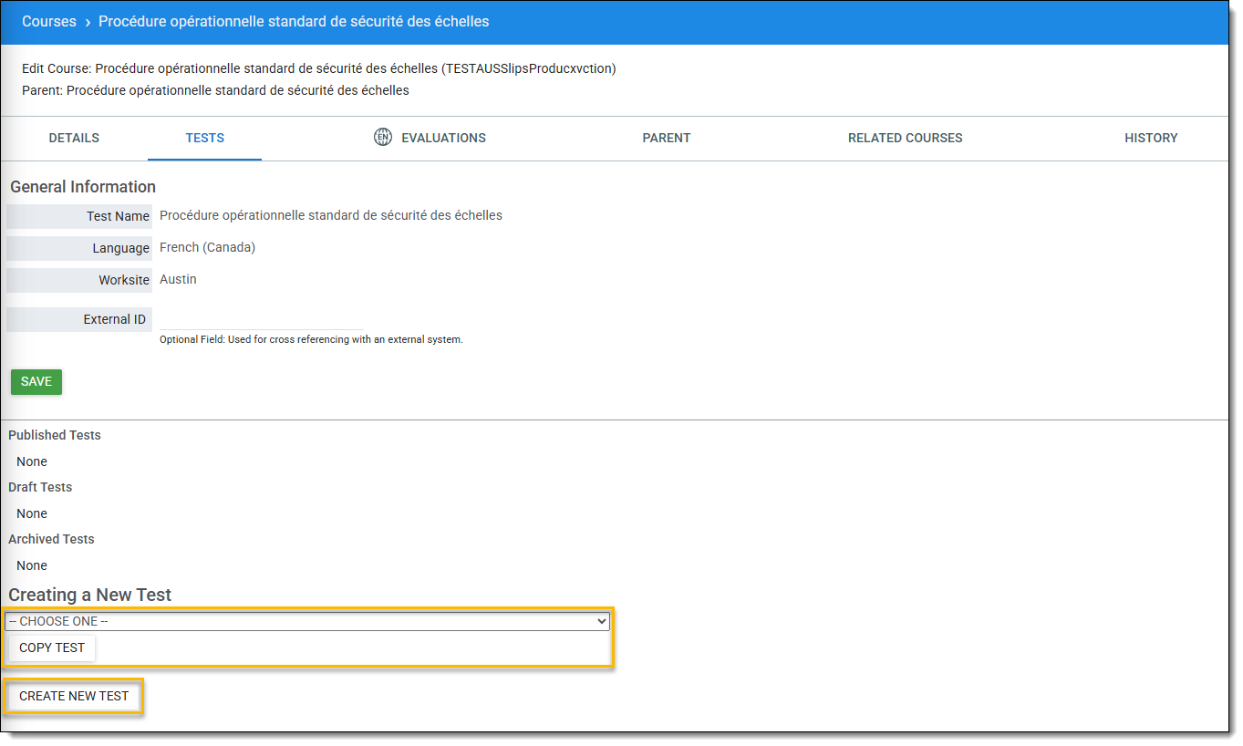 - Remarque: les tests peuvent être publiés en tant que tests autonomes. Les tests liés à un cours doivent être publiés dans l'onglet Test du cours.