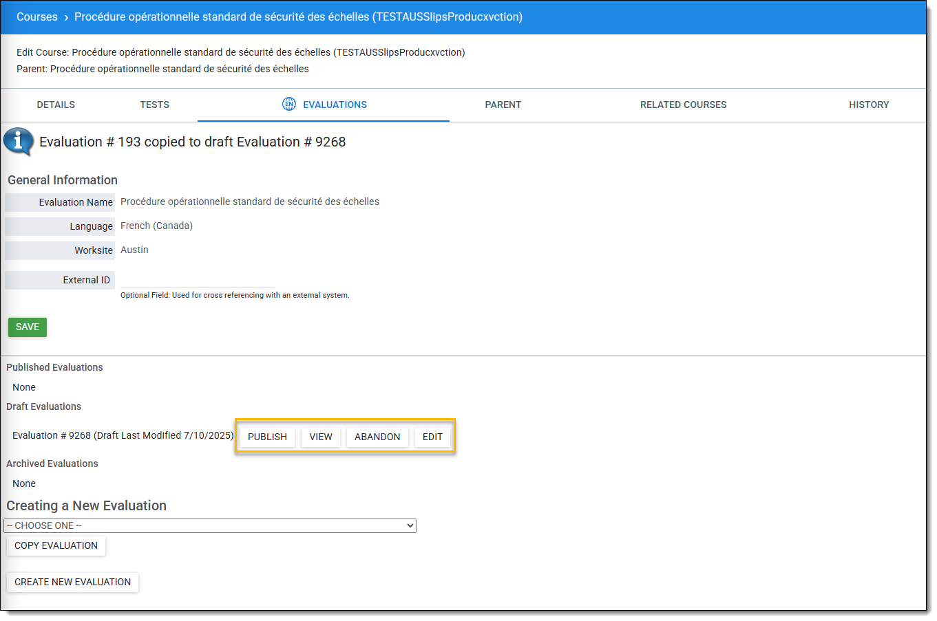 - Remarque: les évaluations peuvent être publiées en tant qu'évaluations autonomes. Les évaluations liées à un cours doivent être publiées dans l'onglet Evaluation du cours.