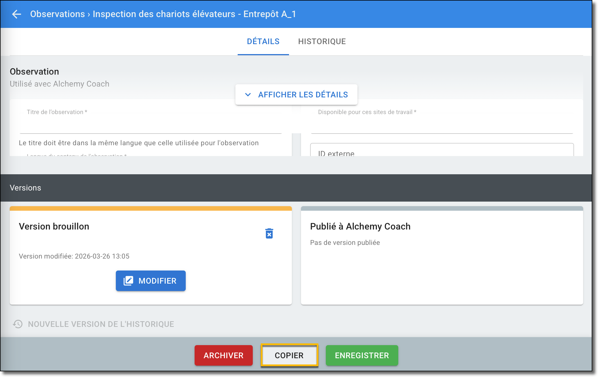 Les observations spécifiques à Alchemy et à l'entreprise peuvent être copiées. La copie de l'observation peut être éditée et sauvegardée comme une nouvelle observation.