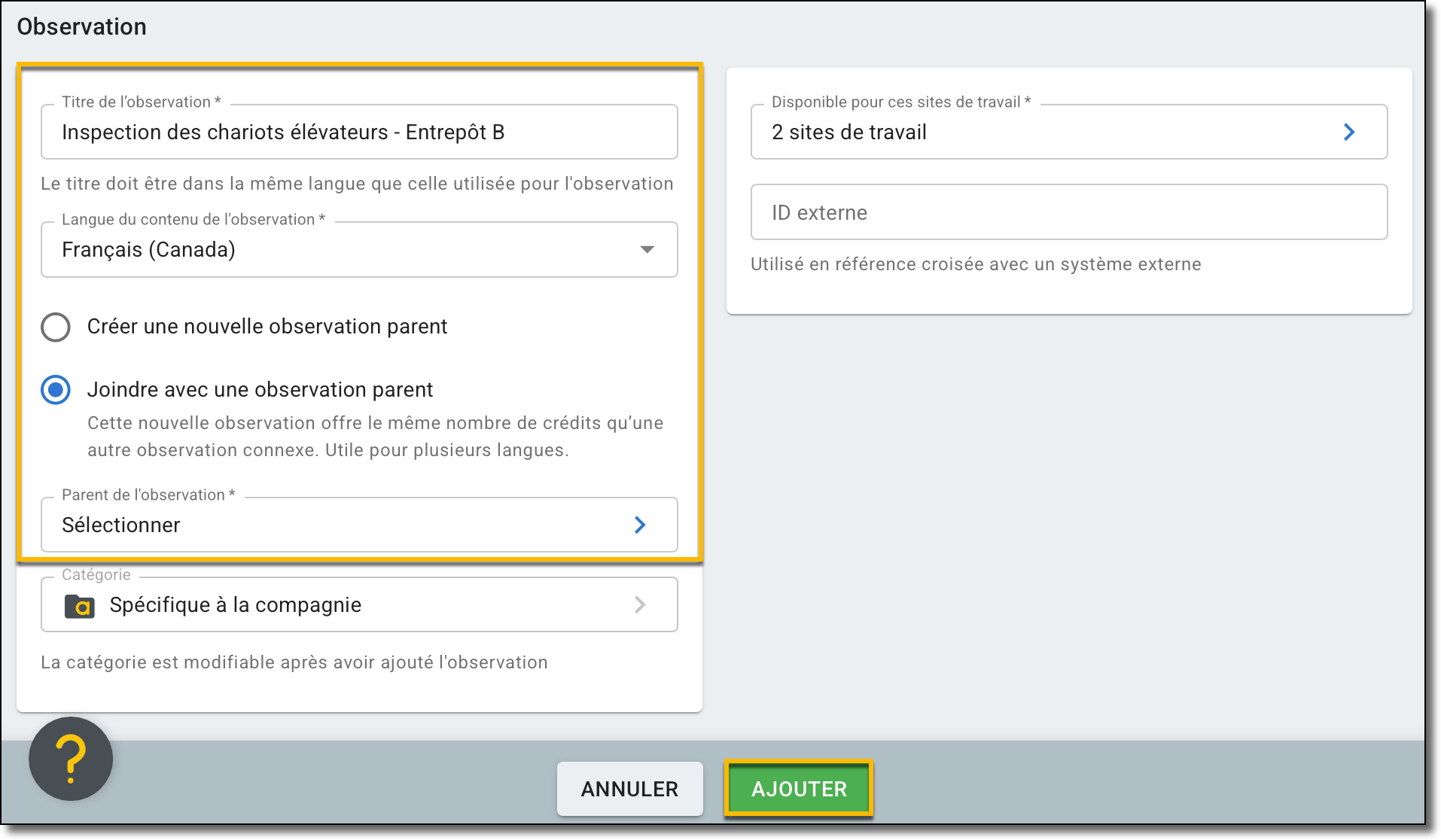 - Sélectionnez l'option Joindre avec une observation parent si l'observation est créditée en tant qu'autre observation.