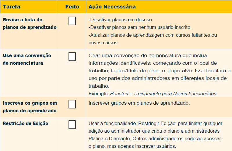 Quando mantidos atualizados, os planos de aprendizado tornam os currículos ativos facilmente acessíveis e relevantes em diversos locais de trabalho. A lista a seguir apresenta fatores essenciais a serem considerados na manutenção dos planos de aprendizado. Consulte nosso artigo Opções de Planos de Aprendizado para conhecer os diferentes tipos de planos disponíveis.