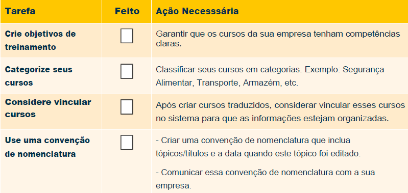 Garantir que o material do curso esteja atualizado é imperativo para qualquer programa de treinamento. Enquanto os cursos da Alchemy são avaliados pela indústria e atualizados com uma cadência de 12 a 18 meses, é crucial que os cursos específicos da sua empresa também estejam atualizados. As tarefas abaixo podem ajudar a manter a integridade das atividades específicas da sua empresa.