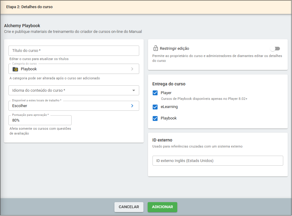Insira todos os campos obrigatórios indicados por asteriscos: Título do Curso, Idioma do Conteúdo do Curso, Local(is) de Trabalho e Nota de Aprovação. Observação: O ID externo é opcional e ajuda a identificar os cursos no Manager com os cursos em sistemas externos.