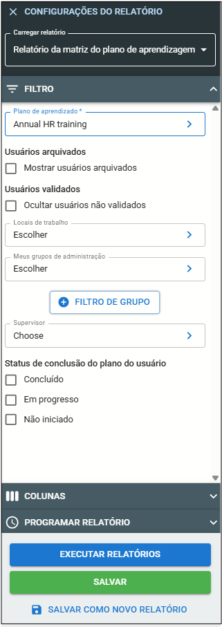 Opções de Filtro para o Relatório da Matriz do Plano de Aprendizagem (Personalizável)