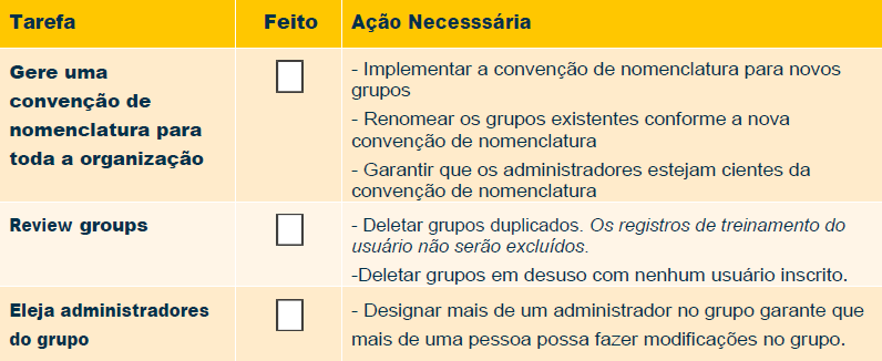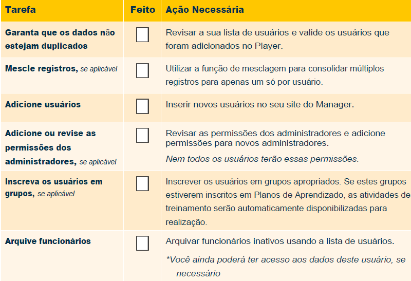Manter uma lista de usuários organizada e atualizada é essencial para garantir a precisão dos seus dados de treinamento. Abaixo está uma lista de verificação que pode ser usada ao trabalhar com usuários no Manager.