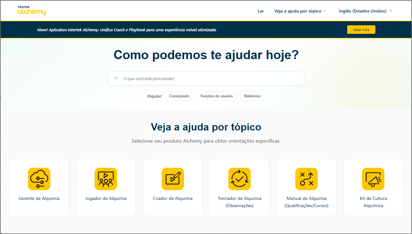 - Página de acesso a links diretos para Learning Unplugged, Central de Ajuda Alchemy, Notícias de Produtos e Requisitos Mínimos de Produtos.